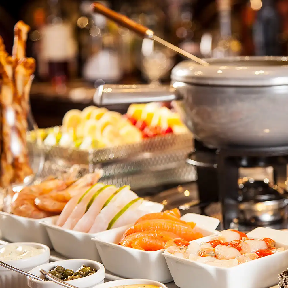 Sequência de quatro passos, incluindo frutos do mar, queijos finos, filé mignon e chocolate belga, proporcionando uma experiência gastronômica romântica e exclusiva. Necessária reserva antecipada.